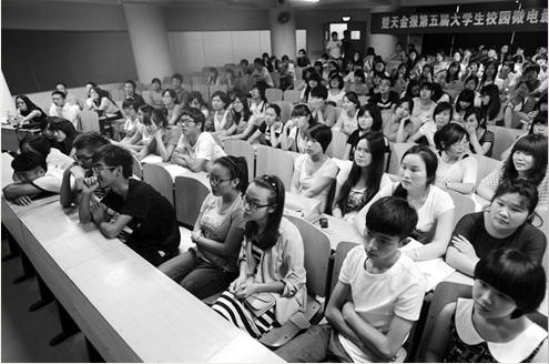 (记者郑志方 实习生陈春瑶 齐薇 通讯员蓝静 )昨晚,本报第五届大学生校园微电影大赛巡展第二站走进武汉长江工商学院,巡展活动受到该校学子的热捧,多位谈感想的同学们,呼吁大家都参与到大赛中来。昨晚7时,该校307放映室已经坐了200多人,且异常安静。记者在活动现场看到,放映的互动环节,同学们回答问题也都非常踊跃,而且很有趣的是,同学们在领取奖品时,在娃娃和书之间,大家都选择了书,该校老师笑着说:“这说明我们学校的学生们都很爱学习,这绝不是装的!”