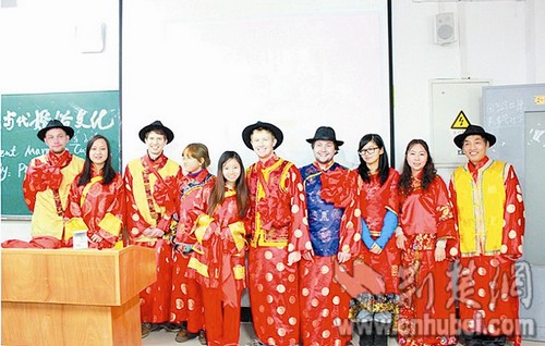 (通讯员 莫玉津) “为什么古代生女孩奖一头猪、两壶酒,生男孩却只奖一条狗、两壶酒?”3日晚,武汉长江工商学院4名外教和学生们一起在校内听了一堂主题为“中国古代和当代婚俗文化”的课程。课间,外教与师生同穿中国古典婚服“拜天地”,感受中国古代婚俗文化。左图:左起4位外教“新郎倌”和他们的中国“新娘”在一起。