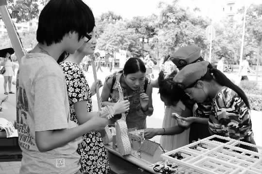 目前,正是高校社团招新大战之际。在武汉长江工商学院,各学生社团都拿出看家本领,在校园里设摊“吆喝”。图为该校心缘手工社招新,队员们展出了手工制作的木质小吉他、世博会的中国馆模型和精美的饰品等, 吸引了诸多新生前来咨询。