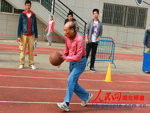 人民网武汉11月9日电( 莫玉津 孙琳黎 吴田芳)昨日,在武汉长江工商学院第九届运动会上,67岁老教师温罗发在运球绕杆的比赛中,被学生们赞为“最有活力的老师”,他也是本次运动会上年龄最大的运动员。