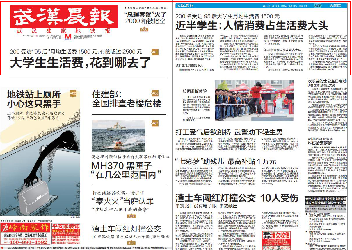 本报讯(记者杨佳峰 通讯员史蓉珍 孙琳黎 罗明亮 杨艳萍)“800元是特困户,1000元是贫困户,1500元刚脱贫,2000元奔小康,3000元算富足。”日前,人民日报官方微博发布了一条微博《妈妈您看,生活费就这么没了》,引起广泛关注。大学生的生活费都去哪儿了?武汉长江工商学院新闻中心就此对武汉部分高校200名95后大学生的生活费进行调查,结果显示95后月均生活费达1500元,其中人情交往花费占大头。