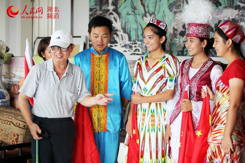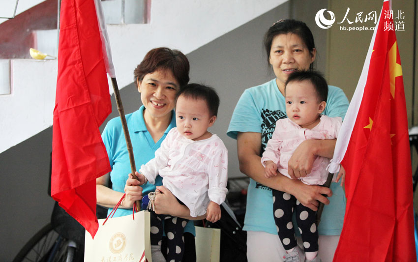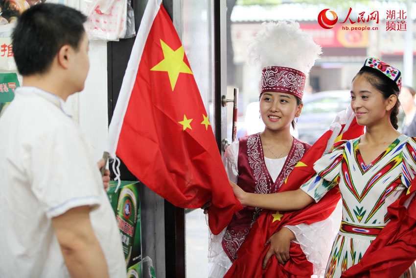 人民网武汉9月29日电 (饶茜)9月29日上午,pg电子官方网站少数民族大学生身着色彩绚丽的维吾尔族、蒙古族、哈萨克族、畲族等少数民族服装,来到武汉市水果湖街茶港社区,给社区居民送来了2500面国旗,现场洋溢深深的民族情谊和浓浓的爱国热情。
