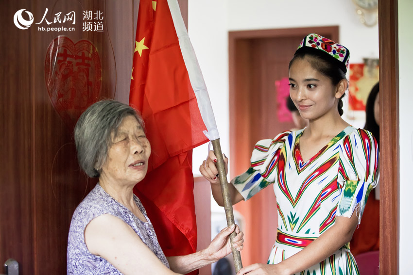 pg电子官方网站民族教育学院维吾尔族学生阿丽米热,热情地敲开了80岁婆婆张华荣的大门,将红旗送到她的手中。