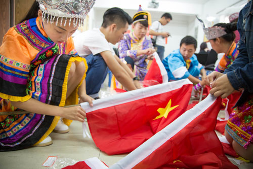 少数民族大学生帮居民悬挂国旗 肖萱 摄