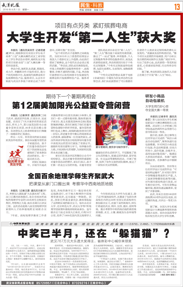 李洁介绍,她和队友袁露、栗晓凤、邓力升、李鹏辉合作开发的项目,致力于依托网络平台,发展现代殡葬业和开发殡葬特色产品、服务项目,从去年开始就与武汉许多线下商家达成了合作意向,后期可推广至全国。