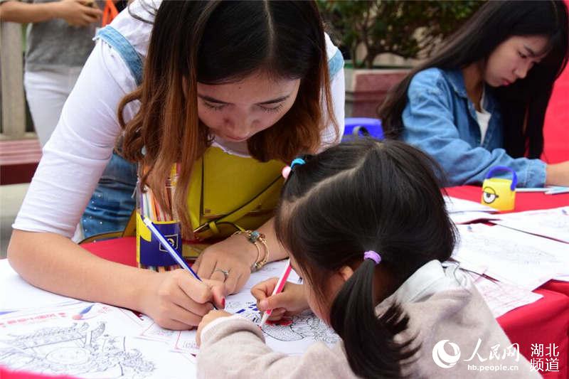 图为学生正在给“楚河汉街”填色(熊名扬 摄)