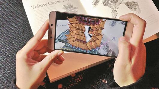 图为:用手机扫“黄鹤楼”三个大字,立体化的黄鹤楼呼之欲出,黄鹤展翅,栩栩如生