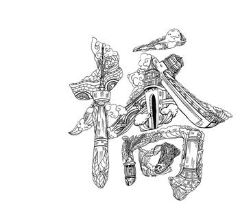 画册里有384个字。乍一看,都是武汉景点和文化地标,如黄鹤楼、龙王庙、水塔,再细看,每个字里别有洞天,藏着相关景物或掌故的图案。