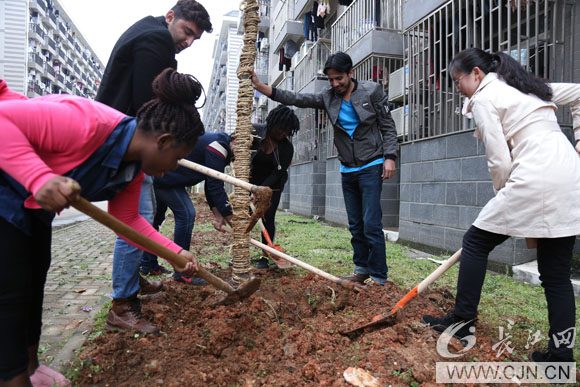 在种植现场,一群手拿铁锹的黝黑肤色学生吸引了大家的注意,他们是该校首届“一带一路”沿线留学生。