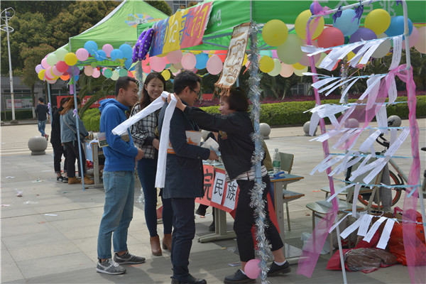 从综合楼通向二食堂的路上,绿色的藤蔓与五彩的花朵编织出一片别样的“天空”,很多藤蔓上还挂着信封,同学们将那些平时不好意思说出口的话,或者不开心的事都写在信上装在信封里,希望今年的春风将它们捎到远方,所以这条路也称“解语林”,引来不少师生驻足合影。此外,食堂门口摆点开展的玩转彩色陀螺、讲解少数民族故事、校史问答游戏也吸引了不少师生过来参与。