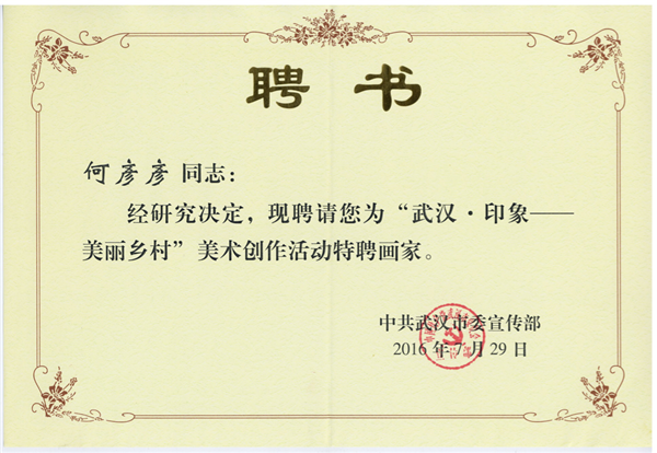 图为中共武汉市委宣传部颁发的聘书