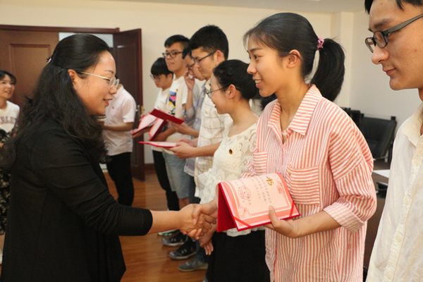 图为青菱街党工委委员、党建办公室主任李梅为王海燕同学颁发聘书  摄影:曲光浩