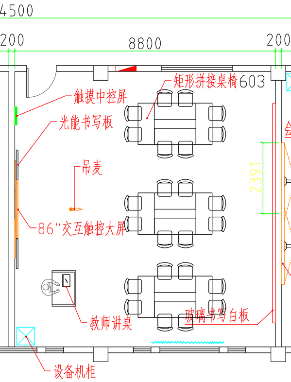 (2)家具:教研桌1套,配套椅9张,固定讲桌2套,移动讲桌1套,6人位研讨桌2套,单人位可移动拼接桌70张,双人位移动可拼接桌40张,学生椅128张。
