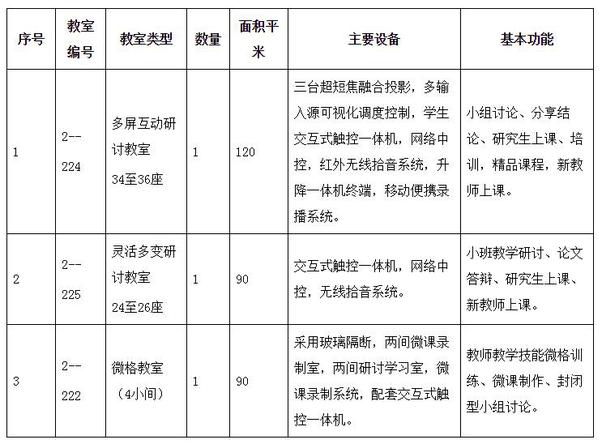 (1)场地:共300 m2。其中多屏互动研讨教室(2-224教室,70座)120m2, 灵活多变研讨教室(2-225教室,40座)90m2,微格教室(2-222教室,4小间)90 m2。