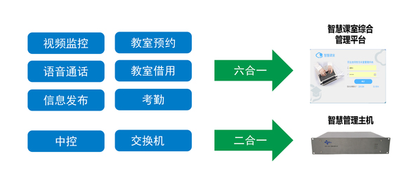 管理平台将多套独立的系统进行整合,纳入到统一管理平台中,实现一个平台管理多套系统,一个平台实现多个系统的功能。集视频监控、教室预约、教室借用、语音通话、信息发布、考勤于一体,减少用户信息化建设整体成本。
