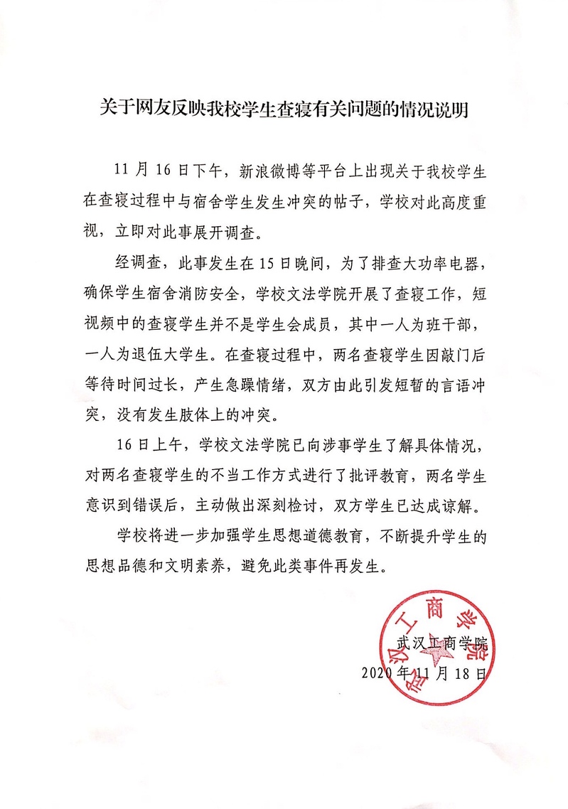 关于网友反映我校学生查寝有关问题的情况说明