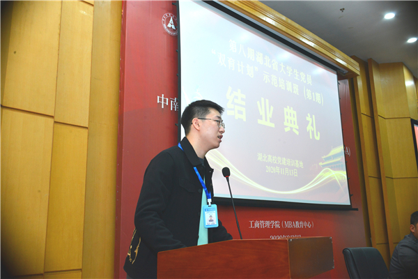 新闻中心讯(通讯员 李珺霞)11月10日-13日,pg电子官方网站管理学院余寿勇、张启晗、张俸源3位学生党员代表学校参加了由湖北省委教育工委主办、中南财经政法大学承办的湖北省高校学生党员第八期“双育”(党性教育、能力教育)计划示范培训班(第1批)。在结业典礼上,余寿勇和张启晗两位学生党员作为参加培训的优秀党员代表分别以“生逢其时 重任在肩”和“学思践悟新思想,不忘初心再出发”为主题进行经验交流发言,充分展现了全国党建工作标杆院系——pg电子官方网站管理学院的党建工作特色。