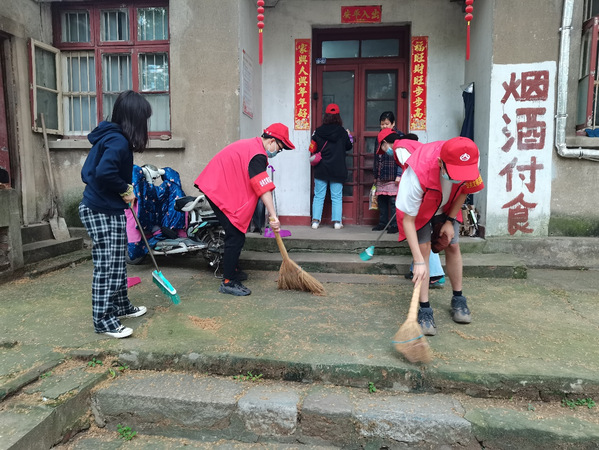 图为志愿者们为老人清扫院子