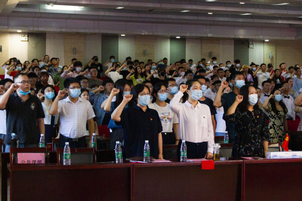 图为刘生元书记带领全体人员重温入党誓词 摄影:李洋洋