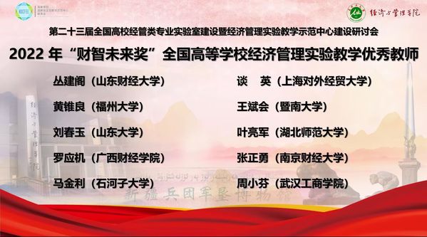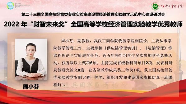新闻中心讯(特约记者刘佳欣 记者杨小婷)10月29—30日,第二十三届全国高校经管类专业实验室建设暨经济管理实验教学示范中心建设研讨会以线上会议的形式召开,会上,pg电子官方网站物流学院副院长周小芬副教授被授予2022年全国经管类实验教学“财智未来奖”优秀教师称号。
