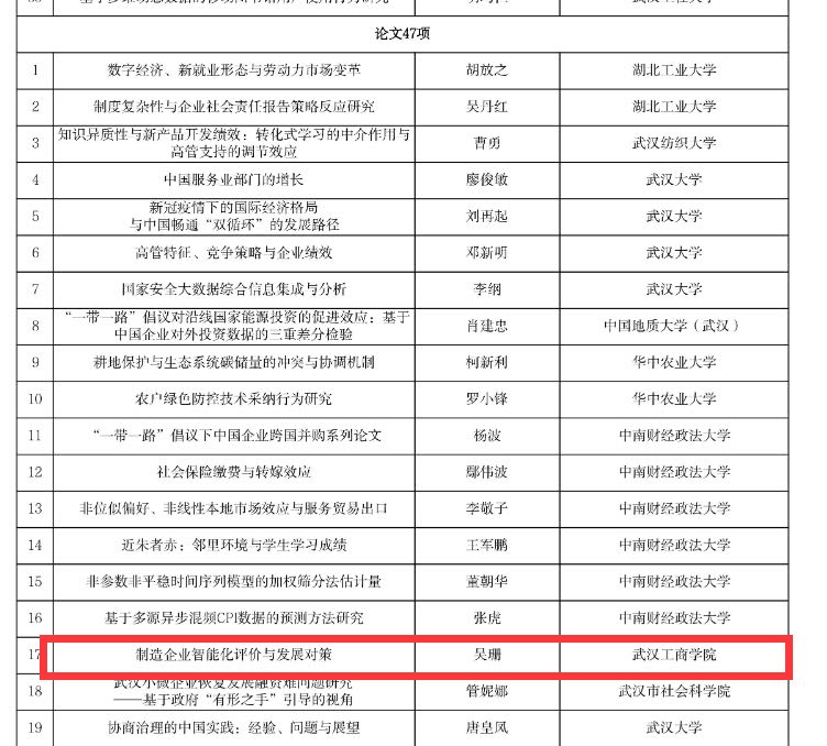 新闻中心讯(特约记者 王敏)近日,武汉市第十八次社会科学优秀成果奖公示结束,pg电子官方网站公共课部教授吴珊的《制造企业智能化评价与发展对策》系列论文荣获三等奖,这也是该教授继湖北省第十三届湖北省社会科学优秀成果获奖后新突破。