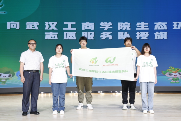 图为武汉市生态环境宣教中心主任汪璞为学校生态环境志愿服务队授旗 摄影:胡毅