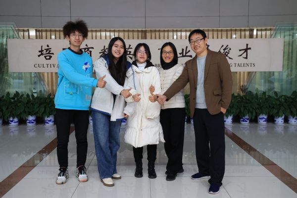 图为获竞赛本科组二等奖的参赛团队(从左至右依次为陈司翰、刘文婷、黄雨薇、梅俊华老师、程斌老师)