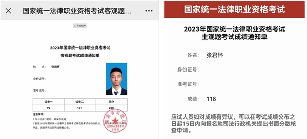 最终,他以客观题200分(全国统一合格分数线为180分),主观题118分(全国统一合格分数线为108分)的优异成绩顺利通过了“法考”,完成了大学期间的第二个愿望。