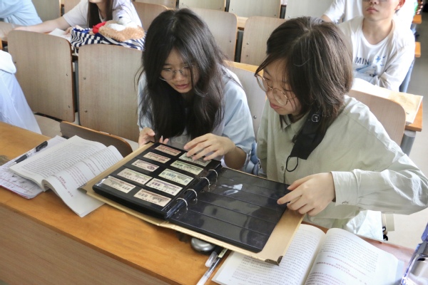 图为同学们正在仔细看老粮票 摄影:杨小婷