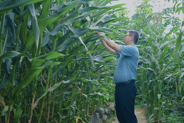 图为王志华在查看农作物长势情况