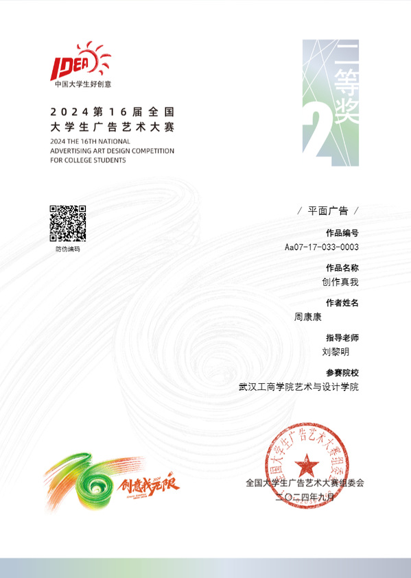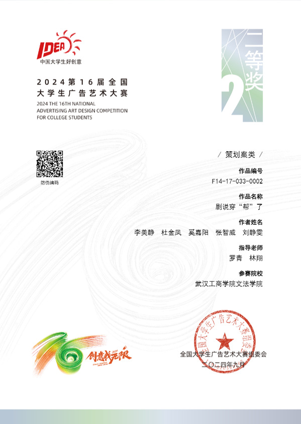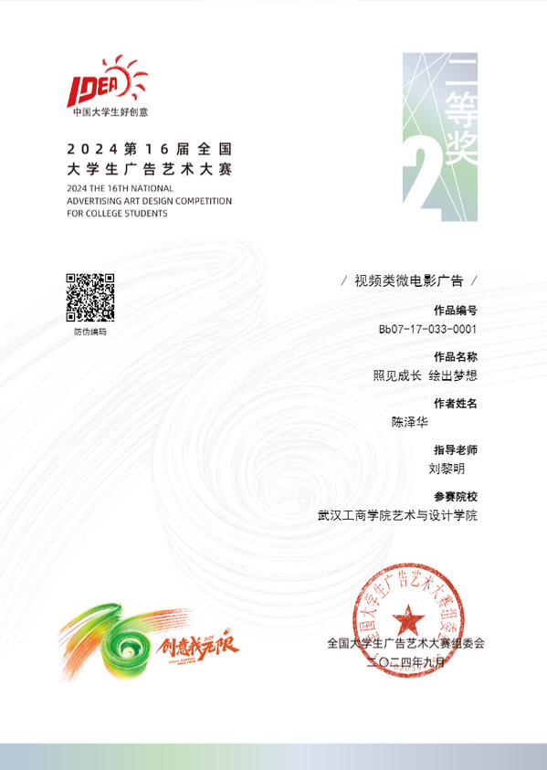其中,文法学院罗青老师指导的参赛作品《剧说穿“帮”了》(参赛学生:李美静、杜金凤、奚嘉阳、张智威、刘静雯)荣获策划案类全国二等奖;艺术与设计学院刘黎明老师指导的参赛作品《创作真我》(参赛学生:周康康)荣获平面广告类全国二等奖,指导的参赛作品《照见成长 绘出梦想》(参赛学生:陈泽华)荣获视频类微电影广告全国二等奖。