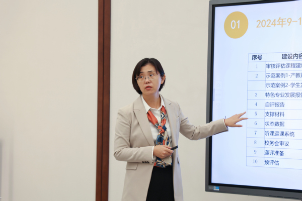 针对下一阶段的评建工作,她提出了四点要求:一是要重点关注学生发展,扩展示范案例内容;二是要进一步凝练学校的办学定位和理念,以评估为契机,以评促建,以评促改,以评促管,以评促强,全面提升学校教育教学质量,充分展示学校教育教学的创新亮点和改革成果;三是各职能部门要增强服务意识,完善值班制度,切实做好学校学生管理、后勤服务和安全保卫等工作;四是要持续加强校园文化建设,推动学校教育与校园文化的深度融合,营造“三全三严三力”的教育教学质量文化,让学生在浓厚的大学氛围中成长成才。