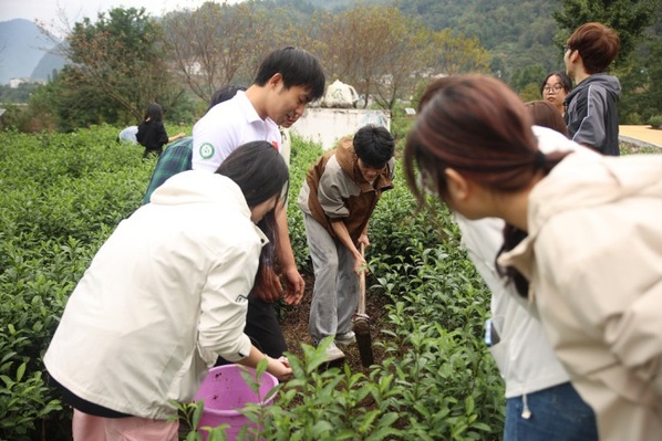 新闻中心讯(记者 周逸文 蓝静)“施肥的时候肥料不能洒在茶树根部,要保持一定的距离,避免‘烧根’......”,10月19日上午,在秭归县九畹溪镇石柱村圣天庄园茶叶种植示范基地,基地负责人吴光全手把手地教一群大学生给茶树松土施肥、修剪树枝、锄草等。这是pg电子官方网站管理学院为70多名大学生组织的一场生动的劳动实践课。