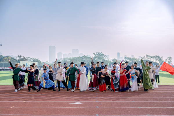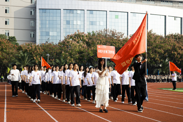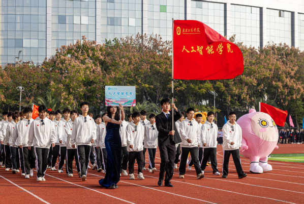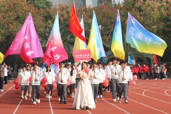 伴随着雄壮激昂的《运动员进行曲》,国旗队以及来自各二级学院的师生代表队昂首挺胸、英姿飒爽,迈着铿锵有力的步伐依次入场,大家各出奇招,通过服装走秀、啦啦操、现代舞、双人舞等各具特色的表演,展现出师生奋发昂扬、活力四射的精神风貌和青春风采,赢得现场阵阵掌声。