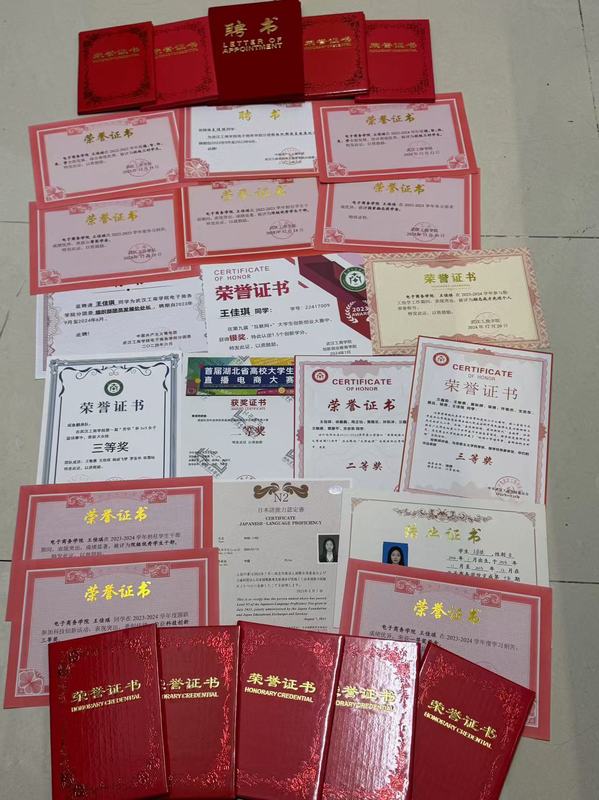 王佳琪:在参加各类比赛的过程中,我确实会遇到一些的挑战。比如在备战湖北省大学生直播电商大赛期间,课程作业和比赛任务时间冲突。那段时间,我几乎每天连轴转,压力挺大的。为了兼顾两者,我制定了详细的时间表,将任务按优先级拆分,并利用碎片化时间处理,最终高效完成了所有任务,并获得了比赛省级二等奖的成绩。