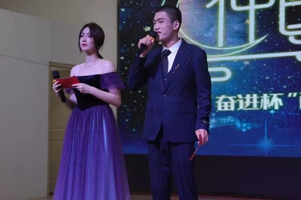 图为侯馨怡在经济与商务外语学院奋进杯主持(左)