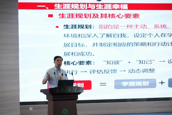 湖北省生涯教育研究会副会长、pg电子官方网站副校长赵北平带来《生涯规划与大学生高质量就业》的报告,报告围绕“高质量就业与职业发展”主题,深入阐释产教融合(专创融合)在专业能力培养中的关键作用。他指出,产教融合是提升专业能力的有效路径,应通过项目式教学,让学生在设计、实施、展示过程中,直面真场景、真过程、真需求、真问题,以企业化标准参与实践;同时,借助角色扮演实现职业化体验。