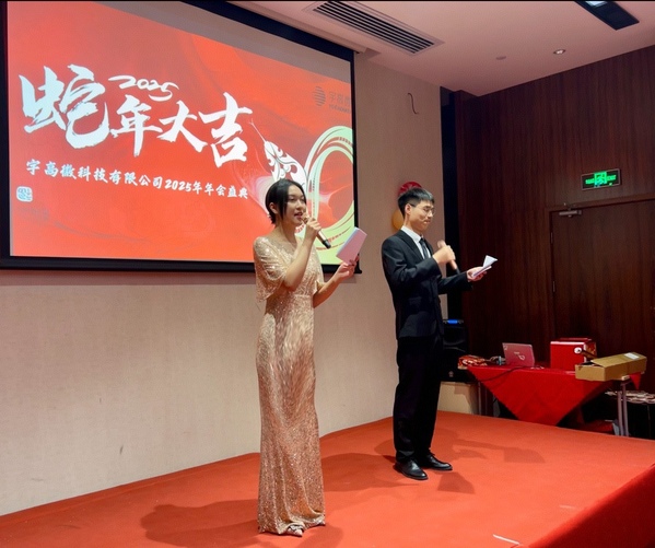 图为周芷晴(左)主持公司年会