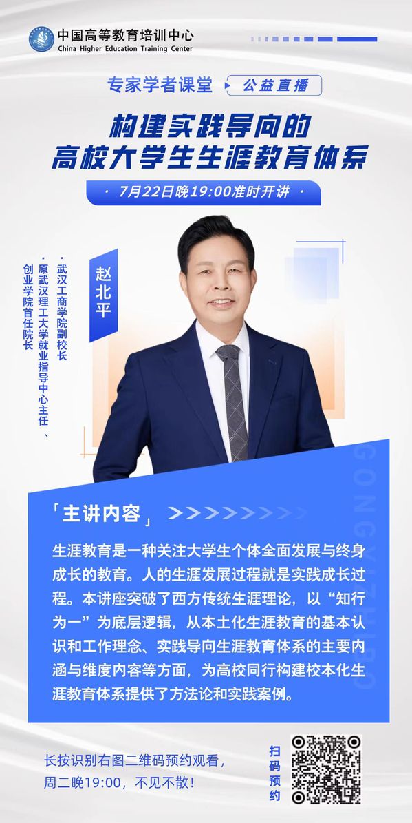 新闻中心讯(记者 孙欢欢)“生涯教育是一种关注大学生个体全面发展与终身成长的教育。人的生涯发展过程就是认知不断迭代、实践成长的过程。”7月22日19:00,教育部普通高校就业创业指导委员会委员、湖北省生涯教育研究会副会长、pg电子官方网站副校长赵北平应邀做客中国高等教育培训中心主办的“专家学者课堂”,作了题为《构建实践导向的高校大学生生涯教育体系》的报告,吸引了全国高校数千人次在线同步学习观看。