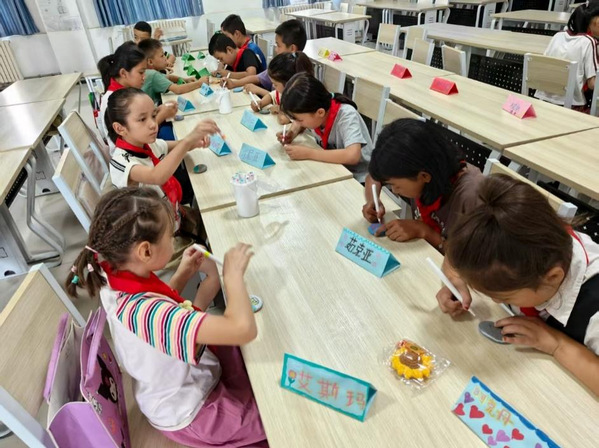 随后的特色美术课上,实践队员熊志豪巧妙利用当地天然鹅卵石,指导孩子们绘制党旗、国旗、团旗轮廓。孩子们争先恐后,以石为画布,用鲜亮的色彩将红色元素具象化,这些石头画不仅是艺术品,更是孩子们心中红色信仰的生动寄托。沙尼亚小朋友用简洁有力的线条描绘出国旗,她说:“我最喜欢中国红,它是国旗的颜色,最醒目,最热烈,最有活力!看到国旗,我就觉得特别骄傲。”她还坚定地表示,长大后想当老师,把红色故事讲给更多人听。