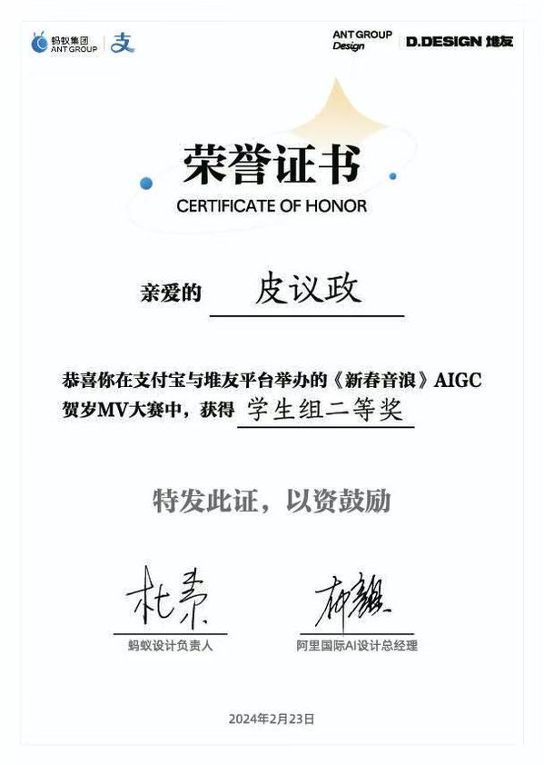凭借勤奋严谨的学习态度与持续不断的实战积累,皮议政大学期间成绩始终名列前茅,平均绩点高达4.3。他尤其重视通过学科竞赛提升自我,将赛场视为“思维训练场”,屡获重要奖项:2022年全国高创新大赛东方设计奖、全国青年设计奖三等奖,2023年荆楚文创设计大赛一等奖、AIart智能艺术大赛三等奖,2024年支付宝“堆友”新春贺岁设计大赛二等奖、“民生政务平台APP设计”三等奖,以及2025年支付宝联合印迹乡村创意设计大赛全国总决赛三等奖等。“竞赛让我打破信息茧房,认清自己的位置,找到自己的不足,也结识了一批志同道合的伙伴。”他补充道。