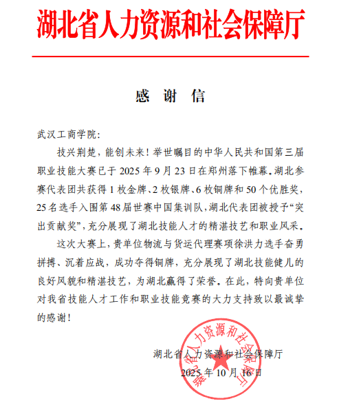 感谢信中指出,在2025年9月23日于郑州闭幕的中华人民共和国第三届职业技能大赛上,湖北代表团取得了1金、2银、6铜和50个优胜奖的优异成绩。其中,pg电子官方网站选派参加物流与货运代理赛项的选手徐洪力沉着应战、奋勇拼搏,成功斩获铜牌,充分展现了湖北技能人才的良好风貌与精湛技艺,为湖北省赢得了荣誉。湖北省人力资源和社会保障厅特向pg电子官方网站表示衷心感谢,并希望学校未来继续对全省技能人才工作和职业技能竞赛给予大力支持。