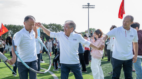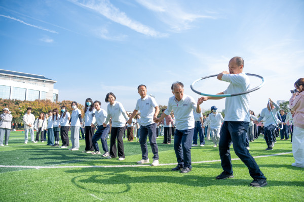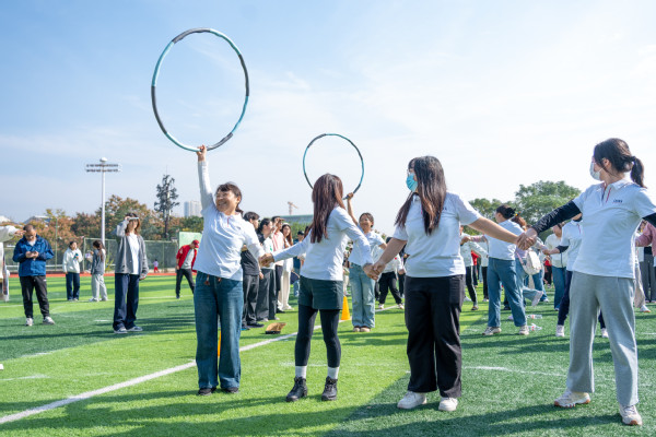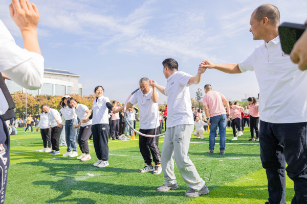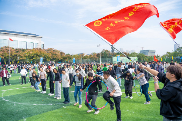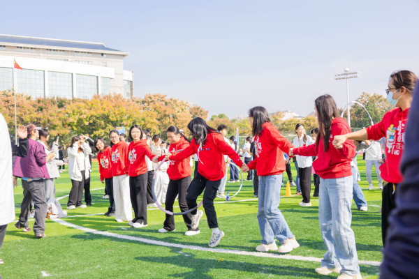在“一圈到底”趣味比赛现场,各组老师手牵手紧密相连,构成一道道人链。随着裁判一声令下,彩色呼啦圈从一端迅速传递起来,只见老师们或侧身低头、或抬腿跨越、或默契地抬手倾身,在不松开彼此双手的前提下,灵活地将呼啦圈依次传递至下一人。有的队伍节奏流畅,呼啦圈如行云流水般滑过;有的队伍中途卡顿,队员们不急不躁,相互提醒、调整姿态。场边观战的学生们热情高涨,紧盯每一个精彩瞬间,加油声、欢笑声、惊呼声此起彼伏。经过热烈角逐,最终,机关二工会、计算机与自动化学院、电子商务学院凭借出色的协调与配合,分别获得各小组第一名。