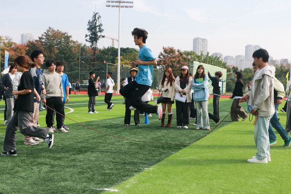 集体跳绳比赛现场气氛尤为热烈。随着裁判员一声哨响,长绳在空中划出优美的弧线,队员们依次鱼贯而入,节奏紧凑、配合默契,摇绳者稳控节奏,跳绳者轻盈跃动,场边观众齐声计数。经过激烈角逐,文法学院代表队凭借低失误的出色发挥和高度统一的团队协作,斩获该项目第一名。