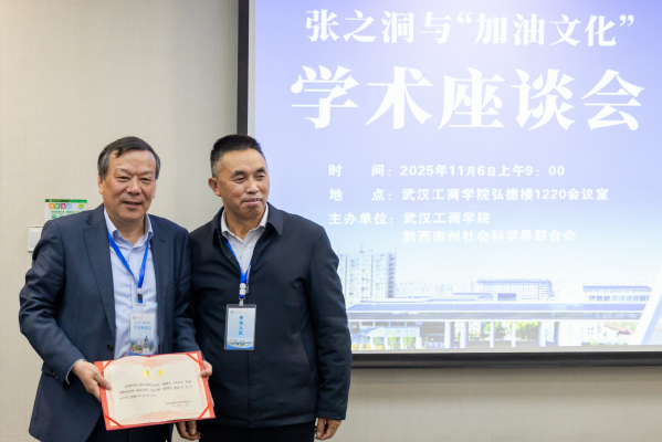 詹河焰向校外专家介绍了学校的基本情况以及马克思主义学院在地方历史文化研究、红色精神传承等领域的丰硕成果。他指出,此次双方共建的“张之洞与‘加油文化’研究中心”既是“校地联合”的优势互补,更是“文化共建”的责任共担,对整合校地资源、推动人文社科研究、服务地方文化发展具有重要意义。他表示,研究中心未来要重点做好三件事:一是“深研”,潜心梳理脉络,挖掘文化内涵,推出高质量成果,成为国内研究张之洞与“加油文化”的重要学术阵地;二是“活用”,推动研究成果走进校园、走向社会,让“加油文化”贴近大众、融入生活;三是“共融”,深化学校与黔西南州在文化、教育等领域的合作。