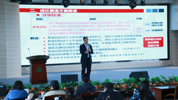 随后,赵北平围绕赛道设置、参赛环节、评审标准等方面对比赛规则作了全面解读,让学生清晰掌握赛事的各项要求。在评审标准分析上,他重点阐释了职业规划合理性与可行性、自我认知准确性、职业目标明确性等核心评判维度。针对职业目标探索实践这一难点,赵北平结合丰富案例,分享了职业体验、行业访谈、实习实践等实用方法,引导学生结合自身兴趣、专业特长与就业市场需求,科学探索并确立适合自己的职业目标。