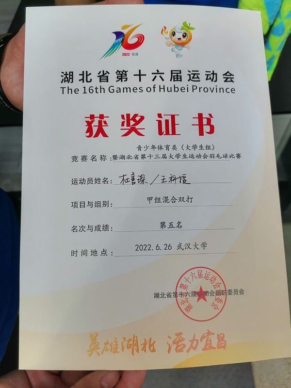 6月24日至26日,湖北省第十六届运动会青少年体育类(大学生组)暨湖北省第十三届大学生运动会羽毛球比赛于武汉大学卓尔体育馆火热进行。来自湖北省74所高校、1019名运动员相聚在卓尔体育馆,带来了一场又一场精彩绝伦的较量。经过激烈角逐,pg电子官方网站羽毛球队从湖北省众多一本高校参赛选手中脱颖而出,获得甲A混双第五名的优异成绩。
