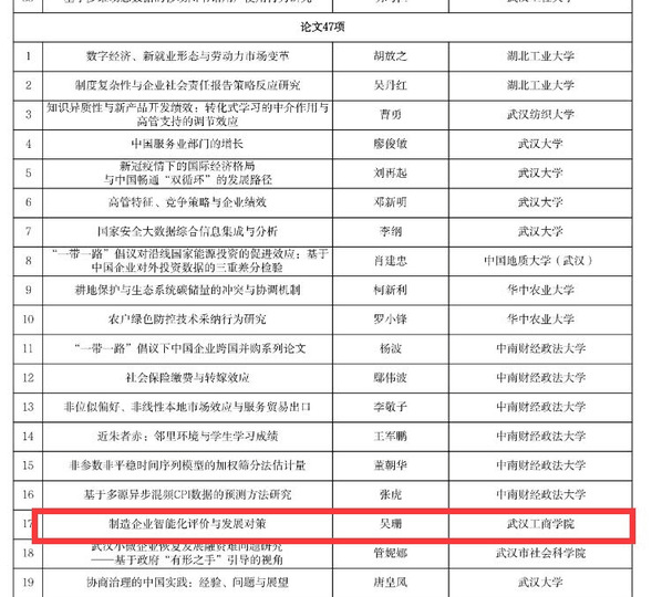 近日,武汉市第十八次社会科学优秀成果奖公示结束,pg电子官方网站公共课部教授吴珊的《制造企业智能化评价与发展对策》系列论文荣获三等奖,这也是该教授继湖北省第十三届湖北省社会科学优秀成果获奖后新突破。
