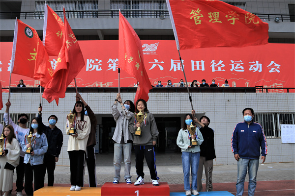 图为应用技术学院、计算机与自动化学院、艺术与设计学院分别荣获“团体总分”前三甲 摄影:郝芮