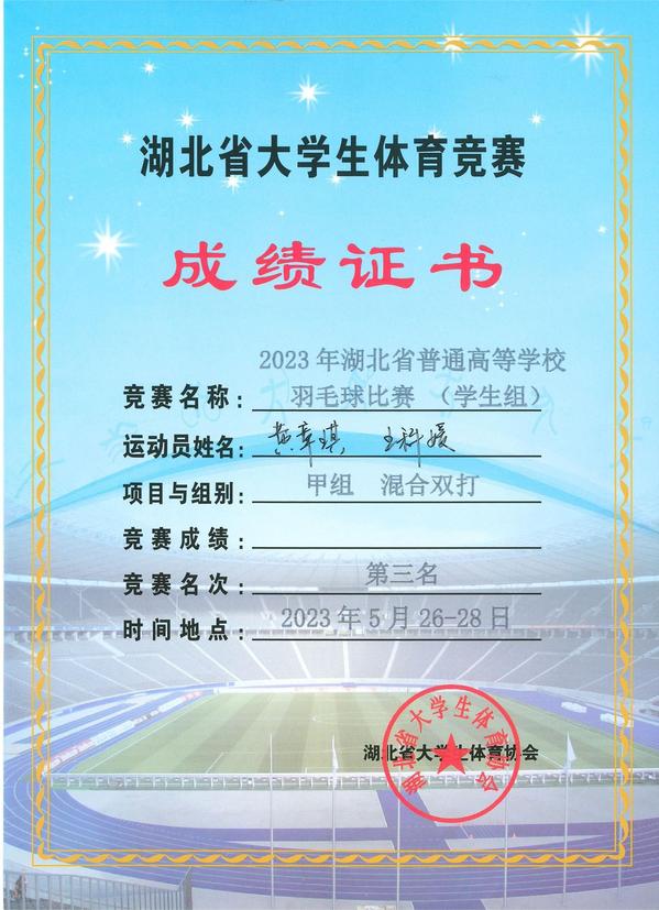 新闻中心讯(通讯员 王承果)5月28日,为期3天的2023年湖北省高校羽毛球比赛在武汉大学落下帷幕,湖北省74支高校代表队,1000多名运动健儿参加了比赛,参赛队伍创历史新高。经过激烈角逐,公共课部羽毛球队队员王科媛、黄章琪获得甲A混双第三名的好成绩。